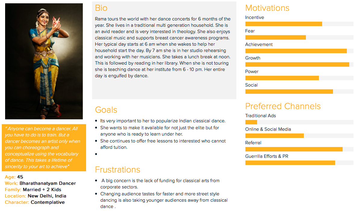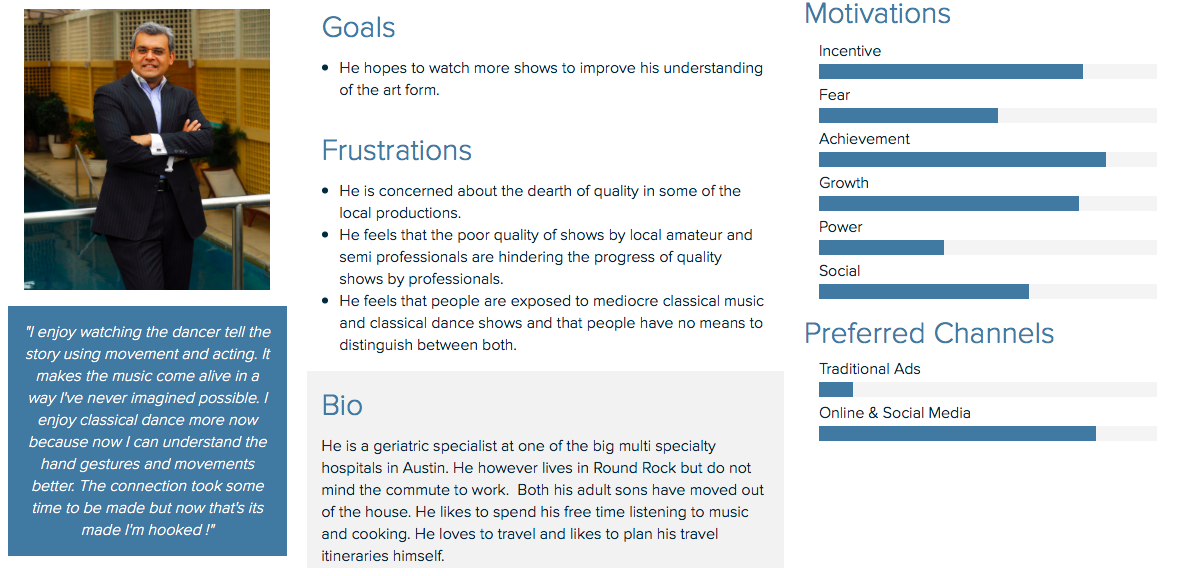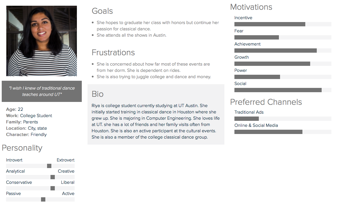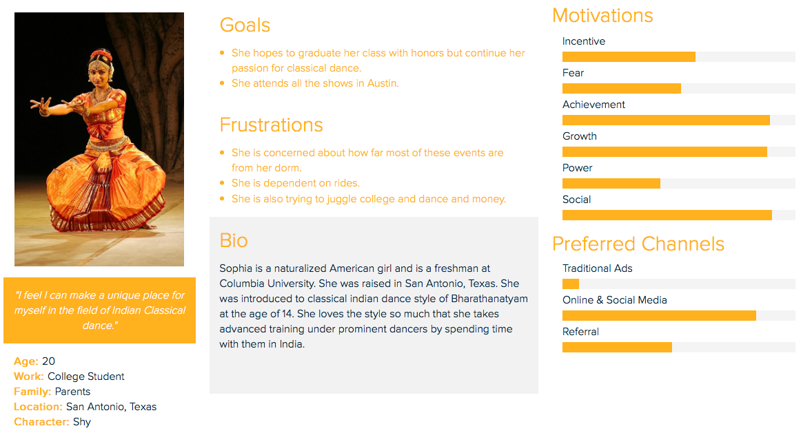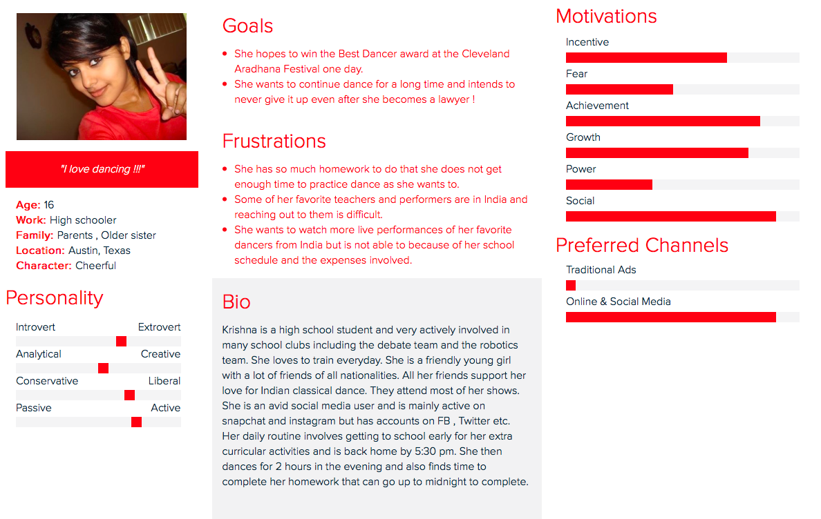 Concerns – Krishna has a lot of homework and finds it very hard to juggle time between all her school responsibilities. She often misses dance concerts because they conflict with her school schedule. She is also dependent on her parents to fund her dance related activities.