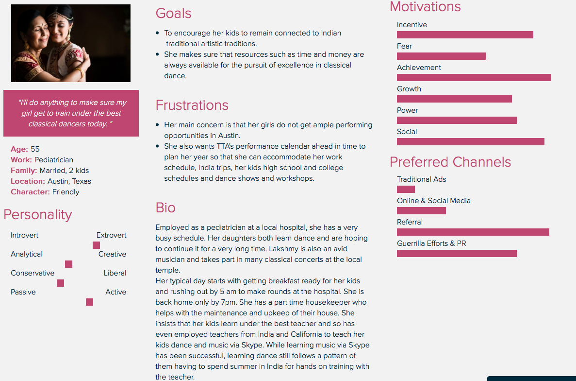 Concerns – Lakshmi is concerned that her daughters do not get enough performance opportunities around Austin. She also wants to plan her calendar months ahead in time so that she can attend all the classical dance events that come to Austin.