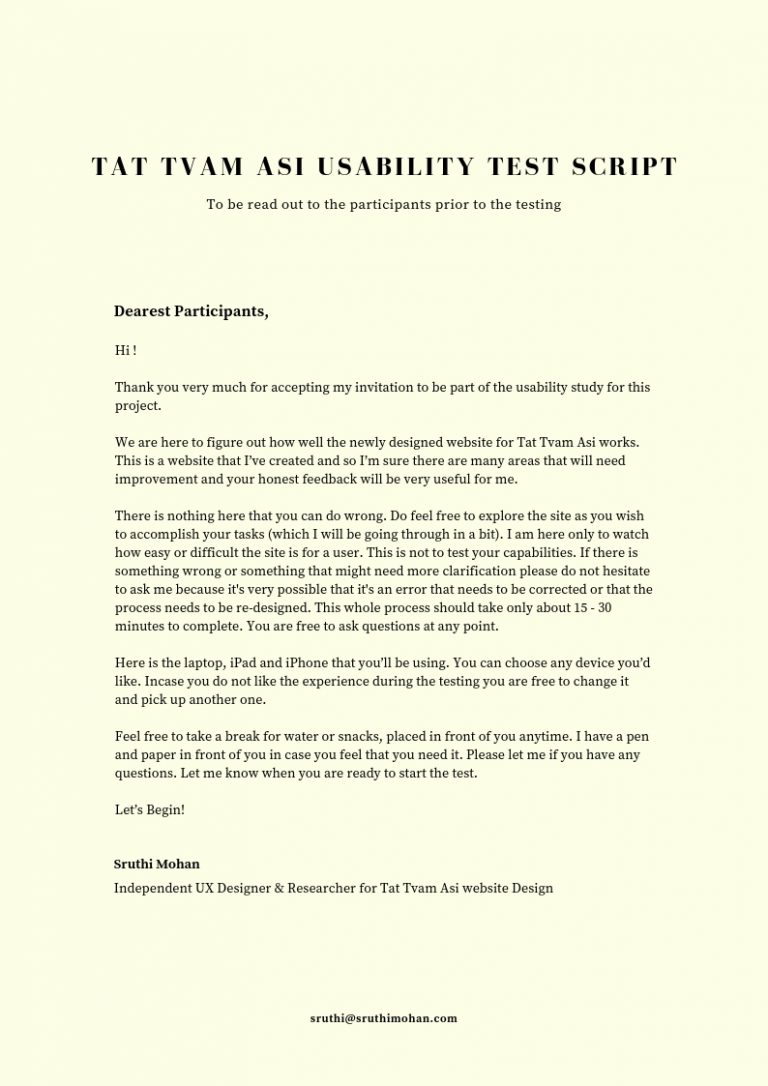 I then wrote a script to be read out to test participants prior to testing. The purpose of writing out the script was to ensure that everyone knew the goals of the study and to make sure that the testing environment was calm and purposeful. This gave everyone, including the tester, an opportunity to ask questions and enter the testing phase in a relaxed manner.