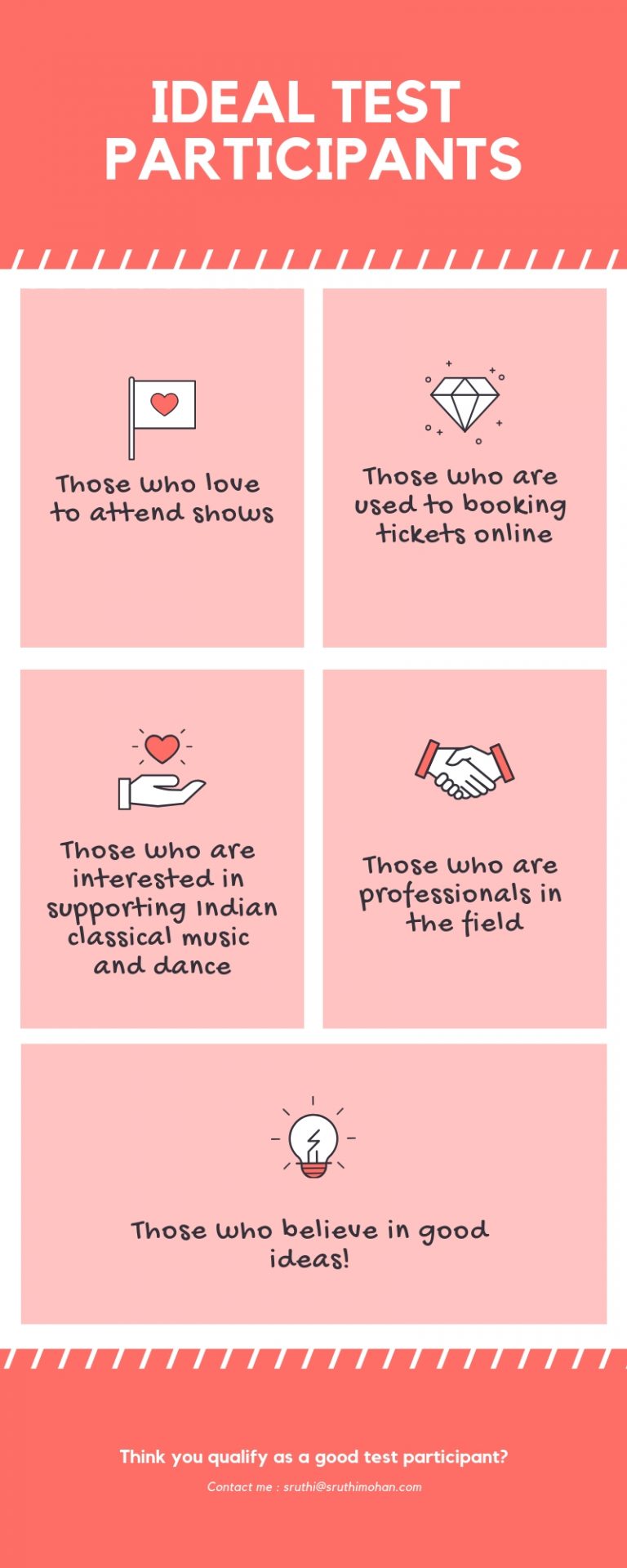 6 users took part in the usability study – 4 adults, 1 high schooler and 1 middle schooler. The test was conducted in my office at my house, in Austin, for 4 people. 2 adults took the test in an office, in a theatre in New York. The average time for completing the study took between 15 – 25 minutes. All participants were from varied backgrounds. They were all tech savvy and were very comfortable about the concept and using devices for checking out information presented online. Their professions ranged from being students to being an engineer, a show curator, a show producer and a doctor. All participants were familiar with classical arts and theatre. They are regular show goers.
